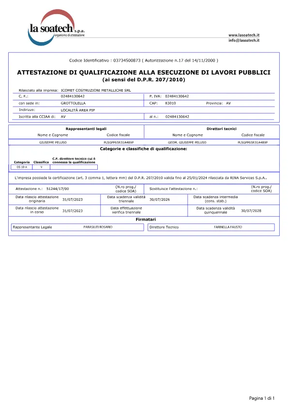 Services S.p.a.). - ATTESTAZIONE SOA – per l’esecuzione di lavori pubblici in appalto diretto, giusta attestazione rilasciata dalla La Soatech S.p.a.