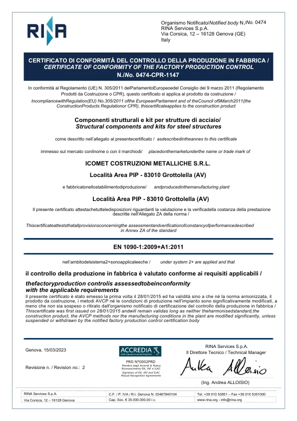 EN 1090-1:2009/A1:2011 – Marcatura CE /CERTIFICATO di CONFORMITÀ del CONTROLLO della PRODUZIONE in FABBRICAper componenti strutturali e kit per strutture in acciaio – (Certificato n° 0474-CPR-1147 del 28/01/2015 – rilasciato da RINA Services S.p.a.)