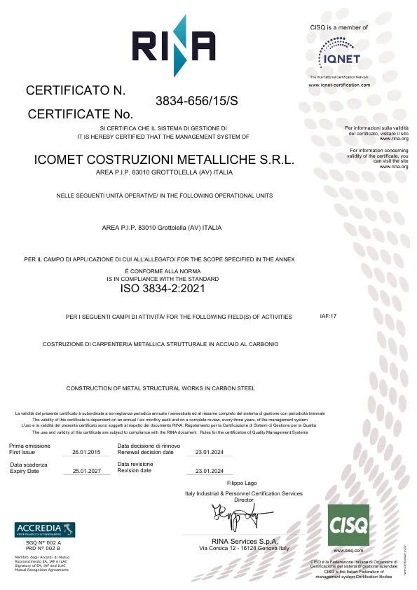 - ISO 3834-2:2005 – CERTIFICATO di SISTEMA di GESTIONE per la QUALITÀ per la costruzione di carpenteria