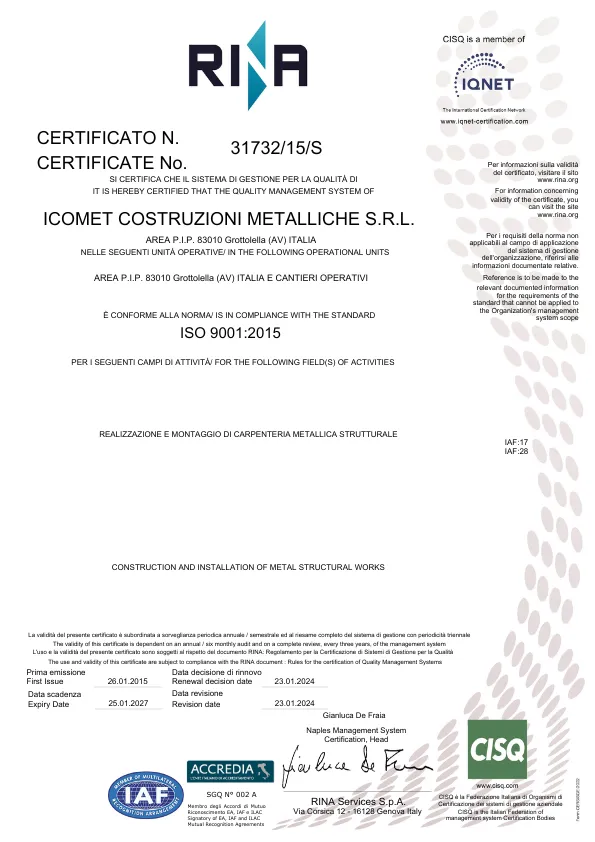 - UNI EN ISO 9001:2015 – SISTEMA di GESTIONE per la QUALITÀ per la realizzazione e montaggio di carpenteria strutturale – (Certificato n° 31732/15/S del 26/01/2015 – rilasciato da RINA Services S.p.a.).